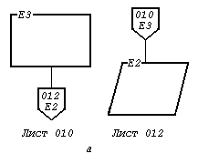 1.4. Координаты зон в виде сочетания букв и цифр присваивают символам, вписанным в поля этих зон, например A1, A2, A3, B1, B2, B3 и т. д. При выполнении схем от руки, если поле листа не разбито на зоны, символам присваивают порядковые номера. 1.5. В пределах одной схемы, при выполнении ее от руки, допускается применять не более двух смежных размеров ряда чисел, кратных 5. 1.6. Для ускорения выполнения схем от руки рекомендуется использовать бланки с контуром прямоугольника внутри каждой зоны. Контуры не должны воспроизводиться при изготовлении копии. 1.7. Расположение символов на схеме должной соответствовать требованиям ГОСТ 19.003-80. Исключение составляют обязательные символы «Линия потока», «Канал связи», «Комментарий» и рекомендуемые символы «Межстраничный соединитель», «Транспортирование носителей», «Материальный поток». 1.8. Линии потока должны быть параллельны линиям внешней рамки схемы. 1.9. Направления линии потока сверху вниз и слева направо принимают за основные и, если линии потока не имеют изломов, стрелками можно не обозначать. В остальных случаях направление линии потока обозначать стрелкой обязательно. 1.10. Расстояния между параллельными линиями потока должно быть не менее 3 мм, между остальными символами схемы - не менее 5 мм. 1.11. Записи внутри символа или рядом с ним должны быть выполняться машинописью с одним интервалом или чертежным шрифтом по ГОСТ 2.304-68. 1.12. Записи внутри символа или рядом с ним должны быть краткими. Сокращение слов и аббревиатуры, за исключением установленных государственными стандартами, должны быть расшифрованы в нижней части поля схемы или в документе, к которому эта схема относится. 1.13. Для удобства детализации программы должны быть использованы символы «Процесс», «Решение», «Модификация», «Ввод-вывод» и «Пуск-останов», при этом внутри символа на расстоянии на менее 0,25a проводят тонкую линию (размер a по ГОСТ 19.003-80). 1.14. Записи внутри символа должны быть представлены так, чтобы их можно было читать слева направо и сверху вниз, независимо от направления потока (черт. 1). Вид а должен быть прочитан как вид б.