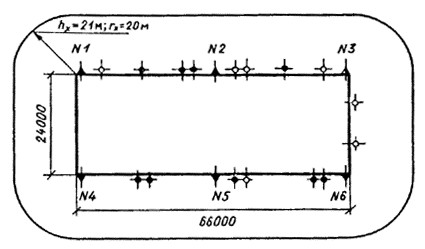 Рис. П4.6. План цеха компрессии азотоводородной смеси (относится к взрывоопасным с зоной класса В-1а) : Условные обозначения: Δ — стержневой молниеотвод (№ 1-6); —.—.—. токоотводящая металлическая полоса; О — газоотводные трубы для отвода в атмосферу газов невзрывоопасной концентрации; • — то же взрывоопасной концентрации