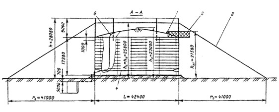 Рис. П4.8. Молниезащита металлического резервуара вместимостью 20 тыс. м3 со сферической крышей и понтоном: 1 — клапан аварийного выброса газов; 2, 3 то же, что на рис. 4.7; 4 понтон; 5 — зона защиты на высоте hх = 23м; 6 гибкий кабель
