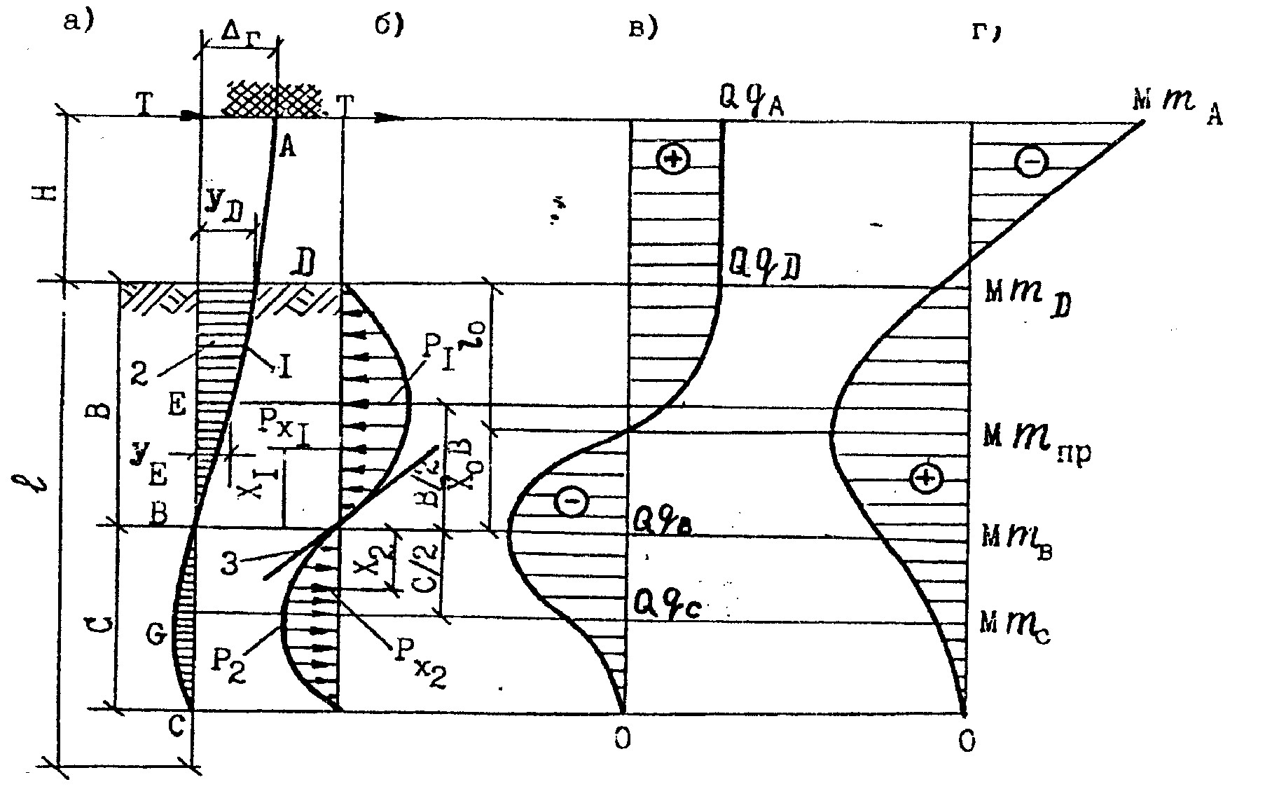 Рис. 8. Схема взаимодействия упругой оси сваи, имеющей шарнирное сопряжение с ростверком, и грунта при действии горизонтальной нагрузки или перемещения а - деформация оси сваи (1) и эпюра обжатия грунта (2); б эпюра давления грунта на сваю; в, г- эпюра поперечных сип и изгибающих моментов в свае; 3 - касательная к эпюрам давления в точке В
