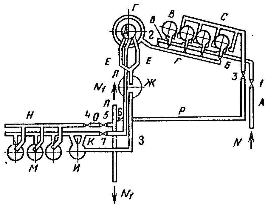 Рис 2. Схема разбивки комплекса сооружений доменного цеха и газоочистки на отдельные участки при испытаний 1 — воздушно-разгрузочный клапан; 2 — смесительный и отделительный клапаны; 3 — дроссельный клапан; 4 — дроссельная группа; 5 — листовая задвижка; 6 — .задвижка; 7 –– задвижка; 8 — клапаны холодного дутья; N — поступление воздуха из воздуходувки; N1 — поступление газа к потребителю Производить осмотр конструкций во время подъема давления и без выдержки, а также остукивание отдельных швов, исправление дефектов, ремонтные работы при наличии давления запрещаются. 3.29. Испытанию на избыточное внутреннее давление подвергаются отдельные участки комплекса сооружений доменного цеха и газоочистки. Участки указаны на рис. 2, а обозначение, наименование их и величины давления при испытании стальных конструкций доменных печей и газоочисток приведены в табл. 15 настоящей главы. 3.30. Допустимые нормы потери воздуха при испытании на герметичность на всех участках составляют от объема испытываемого участка: 3% с оборудованием без заглушек; 2% с заглушками вместо оборудования; 3% с частью оборудования и частью заглушек. Величина утечки воздуха (в процентах) определяется по формуле